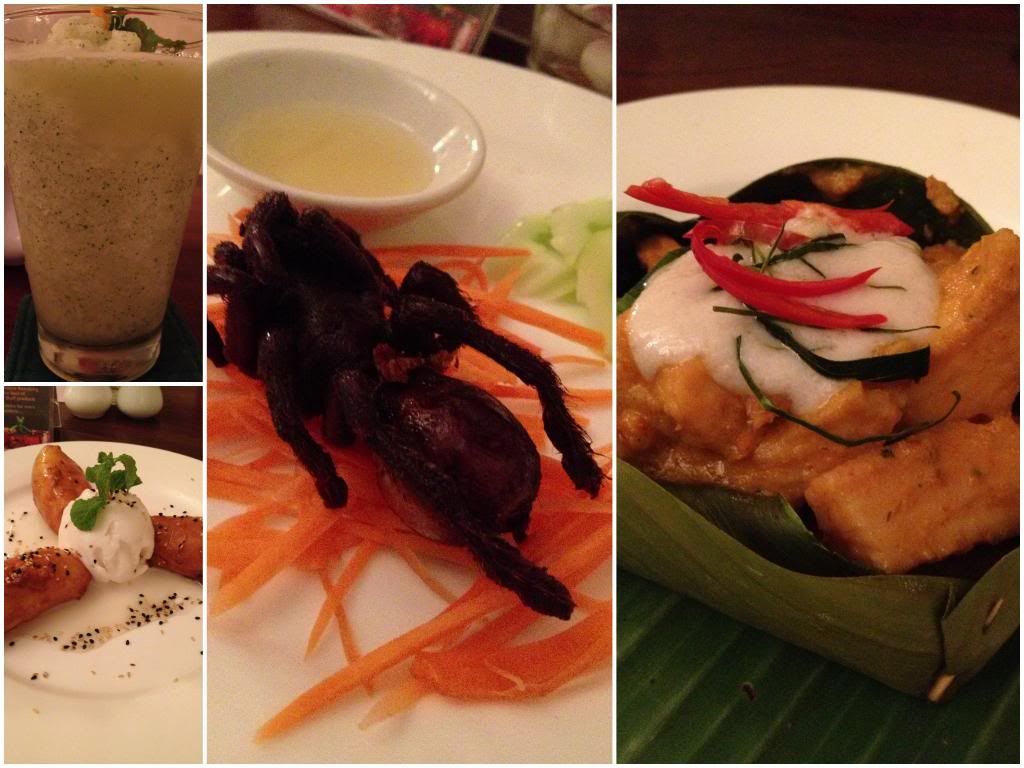 food ordered: (dinner) crispy tarantula, fish amok, banana fritters with lime syrup and coconut ice cream; (lunch) prawn in crispy taro nest with palm wine and honey vinaigrette, steamed mekong river fish with ginger sauce and basil, palm sugar and soy braised boneless duck with chinese cabbage, rice flour and turmeric crepes filled with caramelized banana with coconut gelato.